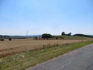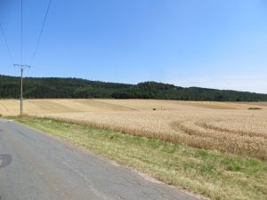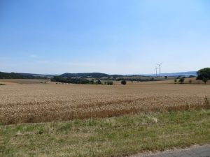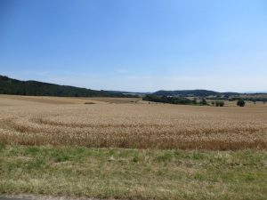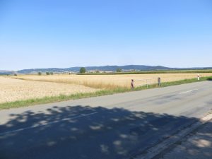 Prachtig is het uitzicht, we rijden meestal tussen korenvelen en kunnen door het golvende landschap kilometers ver kijken. Na de eerste klim komen we aan in Stadtoldendorf. Daar rijden we langs de provinciale weg en dat is minder aangenaam omdat er geen fietspad is. Bij de Rewe kopen we snel druiven, kaas en skyr. Die skyr wordt ter plaatse genuttigd, heerlijk om zo een beker weg te werken en goed voor de broodnodige eiwitten.