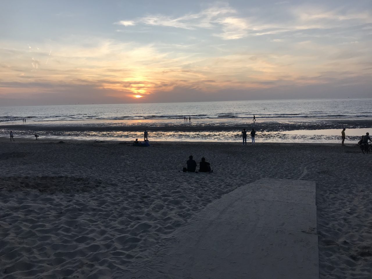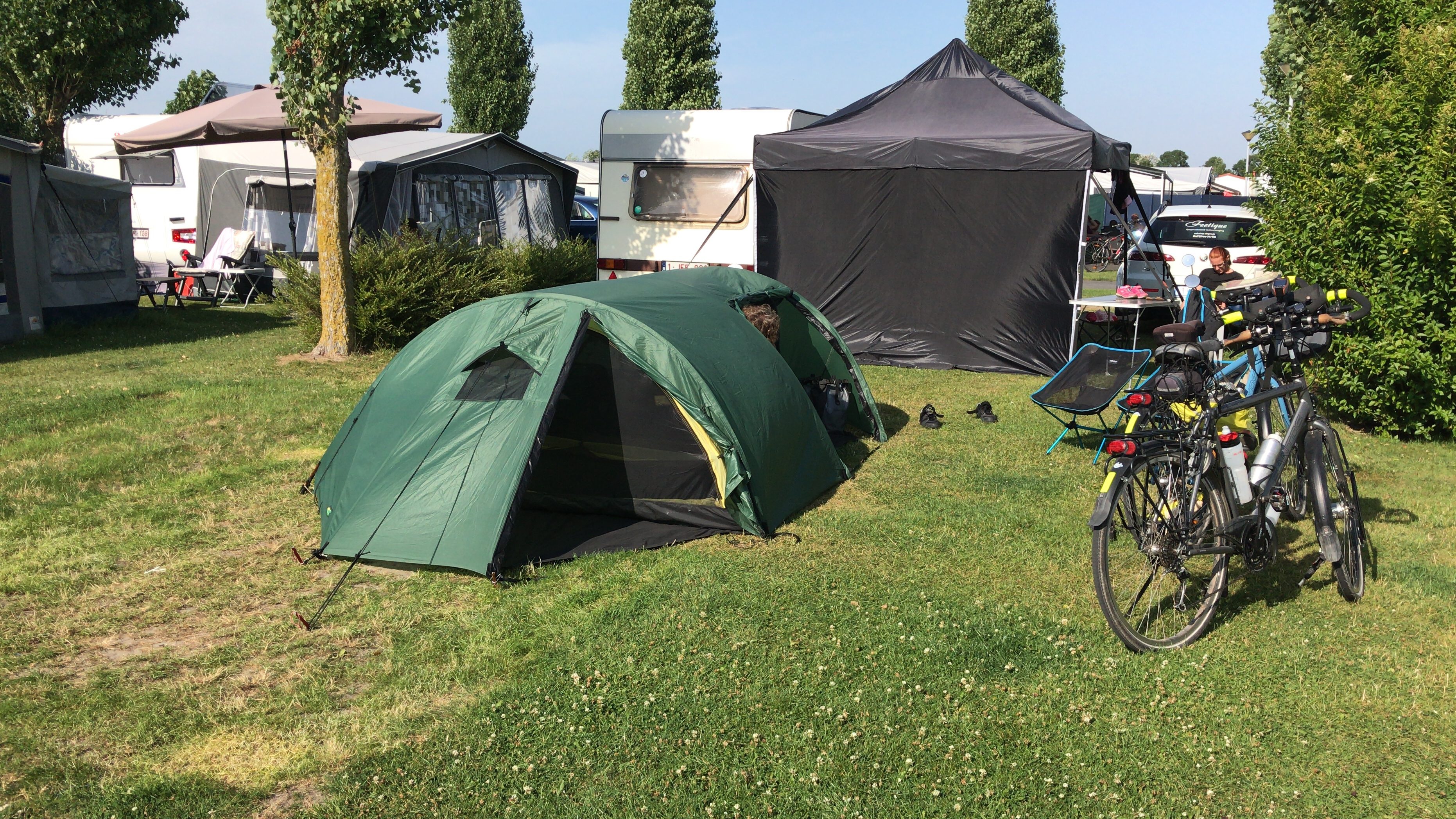 Bij een kruising van kanalen besluiten we de camping in Bredene op te zoeken, die is het dichtste bij en we waren toch wel moe. De camping is snel gevonden en wij slaan snel ons kamp op. Een lekker biertje drinken, douchen, eten in Bredenen, even naar de zonsondergang kijken en dan vlug gaan slapen. We zijn moe.
