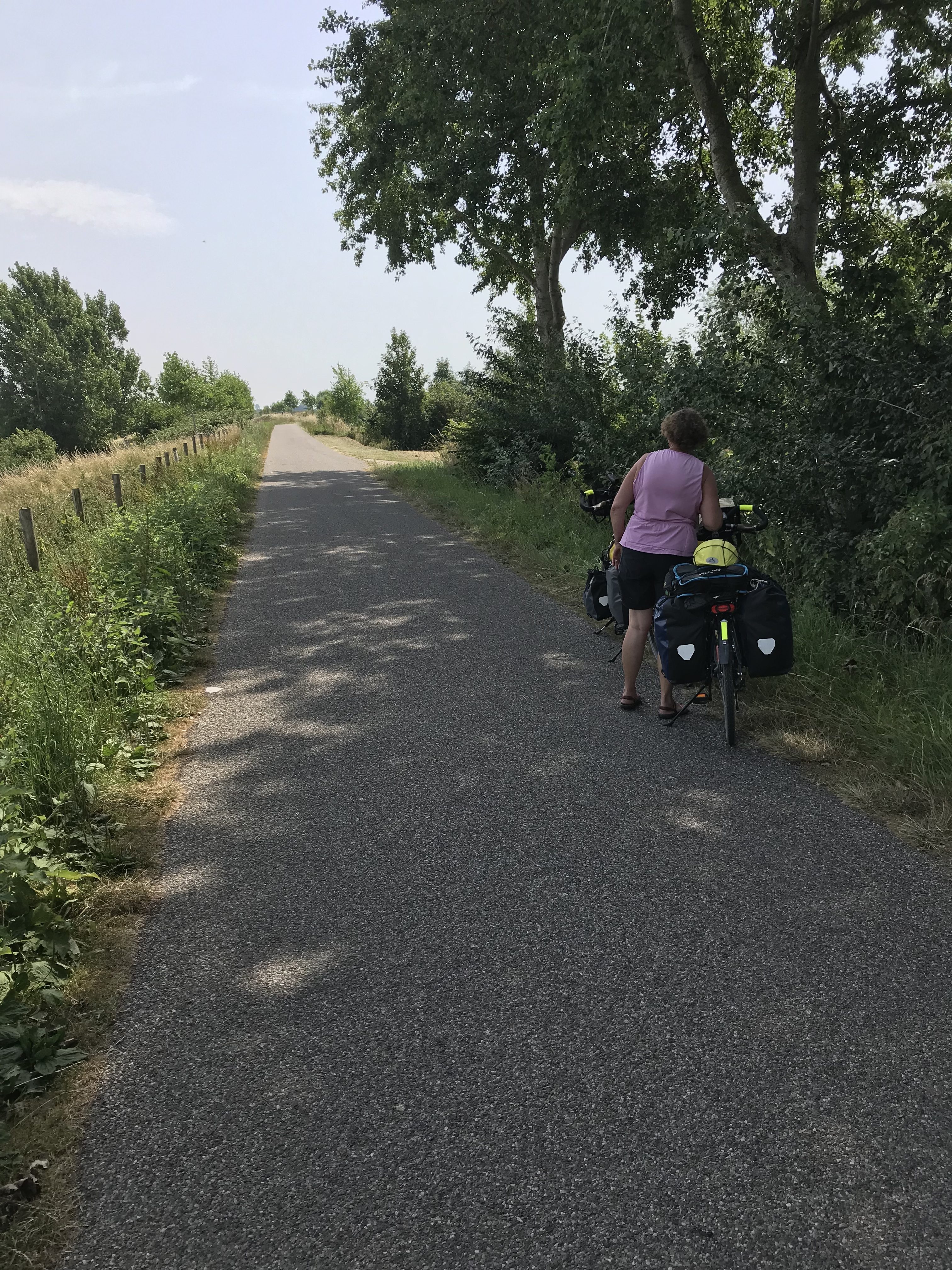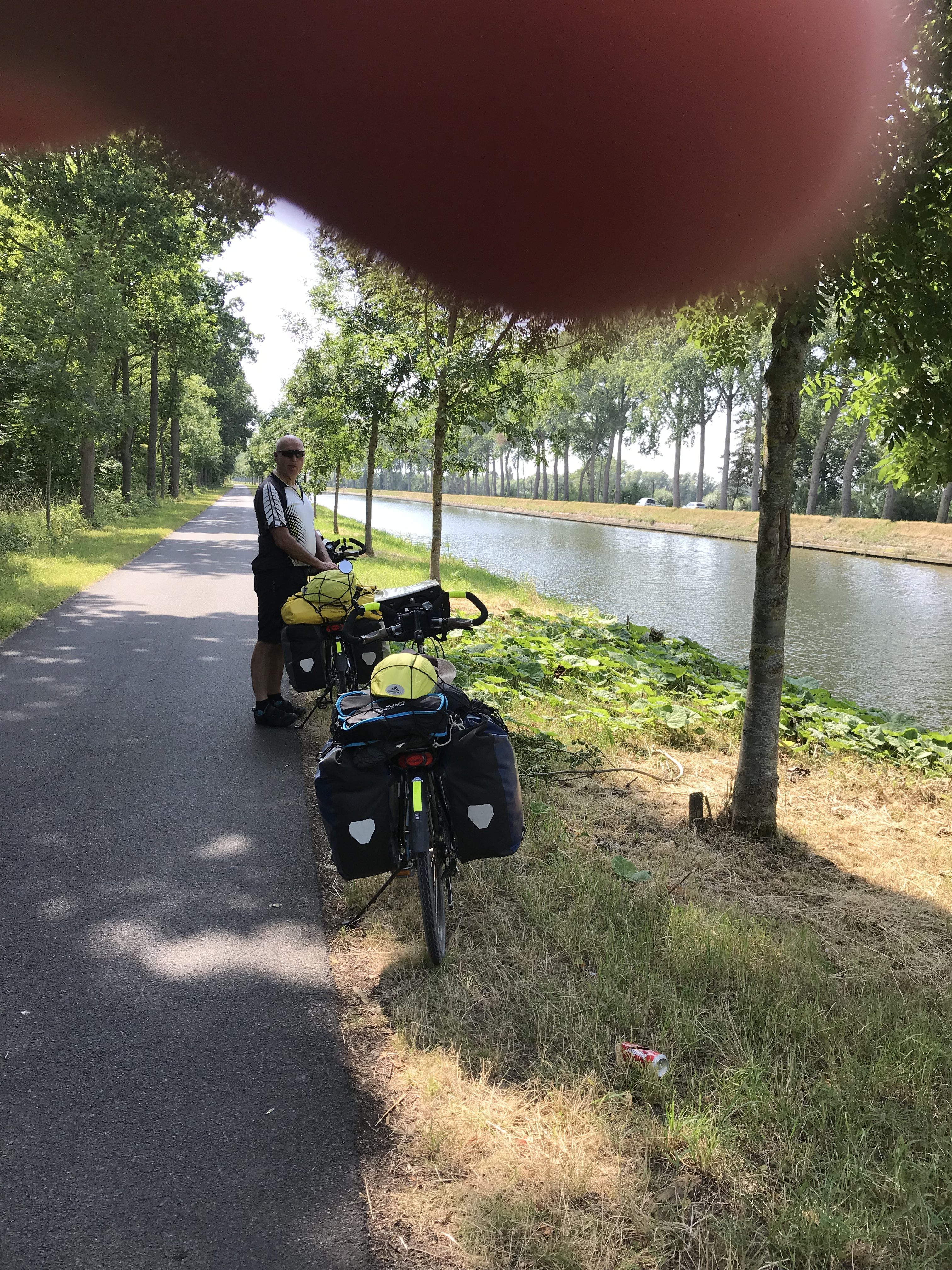 Dan buigen we van de kust af naar Sluis en gaan daar de grens over. Al snel fietsen we langs een kanaal, km’s lang, lekker om afstanden af te leggen, maar saai… en dan ook nogeens de draaiende wind tegen…
